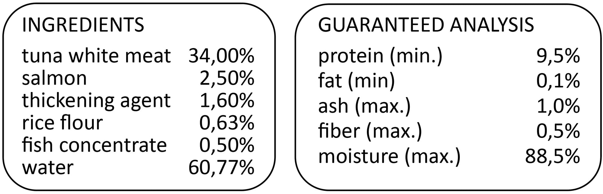 • 原料組成:吞拿魚、三文魚、稠化劑、米粉、魚精華、水